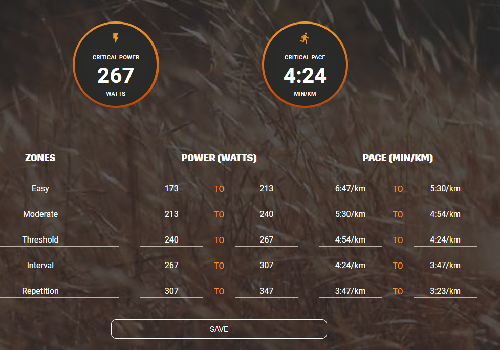 Am Ende hat man also die Daten von einem 800m easy-pace run (Watt und Zeit), von einem 1200m max-effort run (Watt und Zeit) und die Daten eines 2400m max-effort run. Diese Werte trägt man dann in den Einstellungen ein. Die Benutzung der Stryd Seite ist für meinen Geschmack noch etwas umständlich… Und am Ende bekommt man seine Critical Power mit den entsprechenden Trainingszonen.