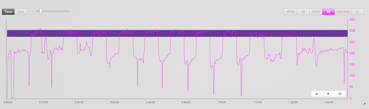 Der Plan war es, die 1000m Intervalle bis 10% über der FTP zu laufen, also zwischen 275 und 303W. Das macht theoretisch ein Tempo von 3:40-4:00 min/km. Ich habe versucht konstant bei ca. 3:50 pro Kilometer zu bleiben.