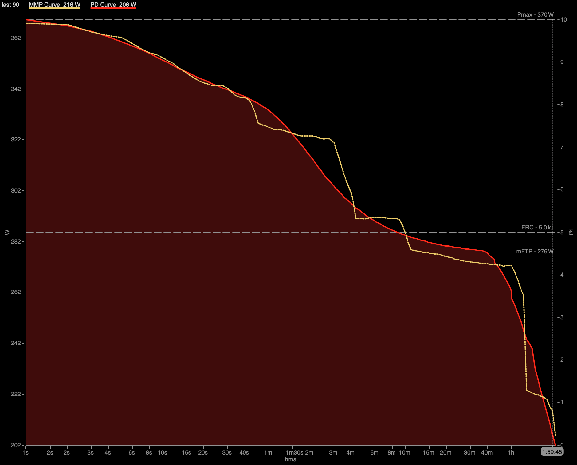 Deshalb benutze ich seit längerem schon WKO4 um meine FTP mit Hilfe der Power Duration Curve zu ermitteln. Dort werden die Rohdaten gezeigt und auch die berechnete Kurve. Dazu wird für verschiedene Dauer die maximale Power aus verschiedenen Trainings der letzen 90 Tage aufgetragen und das dann mathematisch modelliert und die FTP asymptotisch an den „Lacate steady state“ angenähert. Man kann also sehr gut sehen, wo die Daten gut sind und wo nicht (siehe Abbildung unten).