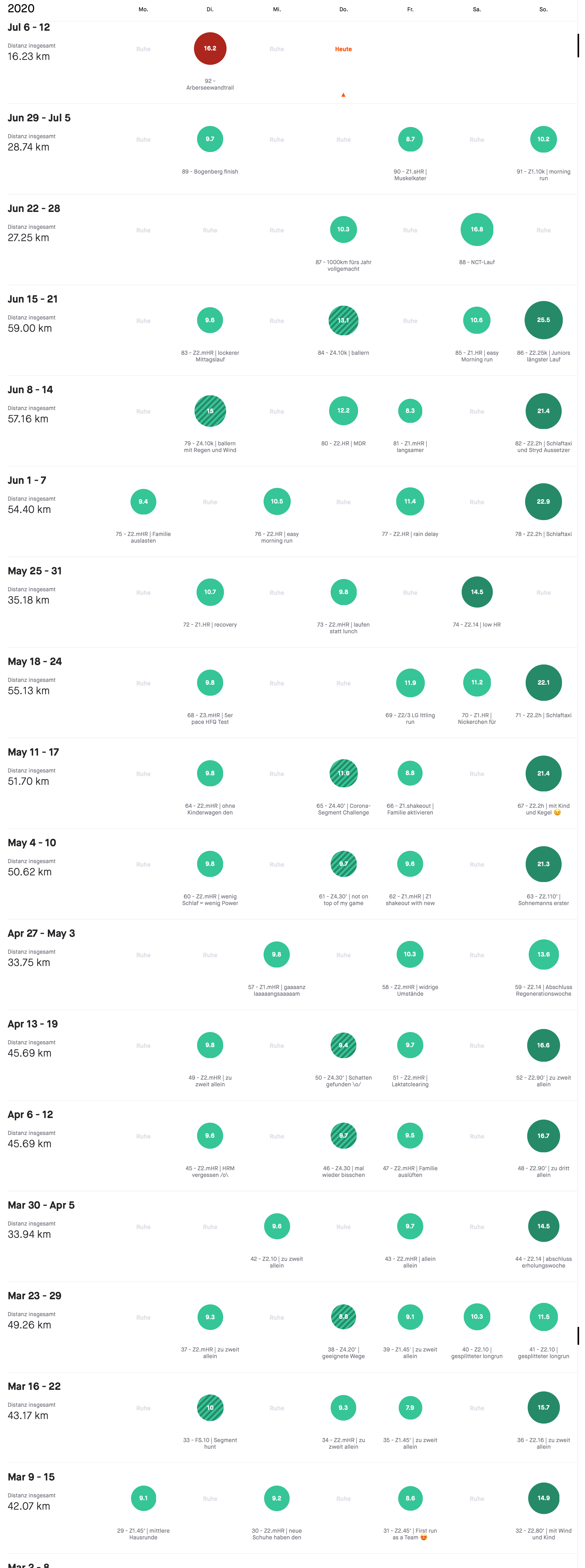 Für die zweite Jahreshälfte werde ich mich allerdings wieder auf die Disziplin Halbmarathon konzentrieren. Ich wollte ja eigentlich am 25.10. den Halbmarathon in Valencia Laufen. Ich denke aber, dass dieser nicht stattfinden wird. Ich werde aber dennoch so trainieren, als würde er stattfinden und am 25.10. dann entweder einen anderen Halbmarathon laufen oder einen kreativen Halbmarathon auf einer selbstgewählten Strecke. Vielleicht starte ich auch mein eigenes “Breaking 2” Projekt und heuere Windschattengeber an :P. Nach meinem Urlaub habe ich noch eine Woche “Sommerpause” und ab Ende Juli versuche ich wieder etwas Geschwindigkeit und Spitzigkeit in meine Beine zu bekommen, das ganze langsam Laufen hat sie doch schon sehr Träge gemacht. Wie es damit weitergeht werdet ihr dann bald hier lesen.