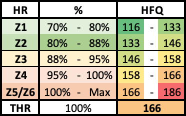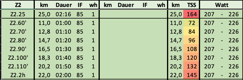 Ich hab in älteren Artikeln schon öfter über meine Trainingsgrundsätze geschrieben, allerdings wollte ich es hier nochmal kurz zusammenfassen und den aktuellen Stand darlegen. Ich plane mein Training mit meiner historisch gewachsenen Exceltabelle gern für das ganze Jahr im voraus, dabei berechne ich mir aus der aktuellen CP/FTP die entsprechenden Belastungswerte (TSS) für die einzelnen Trainingseinheiten und versuche so mein Training ausgewogen zu gestalten [6]. Für die einzelnen Läufe benutze ich für Grundlagenausdauerläufe den Puls als Richtwert, hier nutze ich den Puls an der Laktatschwelle als Basiswert und leite daraus die Pulsbereiche ab.