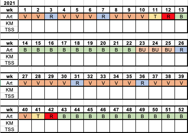 Der erste Schritt in der Planung meines Laufjahres ist, das Jahr aus der Vogelperspektive zu betrachten. Was steht dieses Jahr an? Gibt es schon Zeiträume in denen ich nicht trainieren kann bzw. in denen es schwer wird mit dem Training, weil zB ein Urlaub, eine Dienstreise oder ein anderes großes Event ansteht? Wenn man solche Zeiträume identifiziert hat kann man dies in der Jahresplanung dementsprechend berücksichtigen.