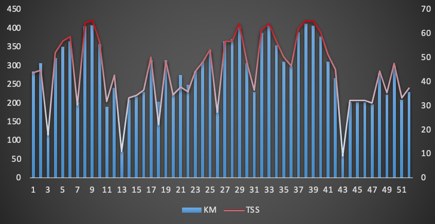 Am Ende sieht die Jahresbilanz in Kilometer und TSS wie unten aus und ich habe ca 2300km geplant. Man kann schön die Ruhewochen und die allgemeine Periodisierung erkennen.