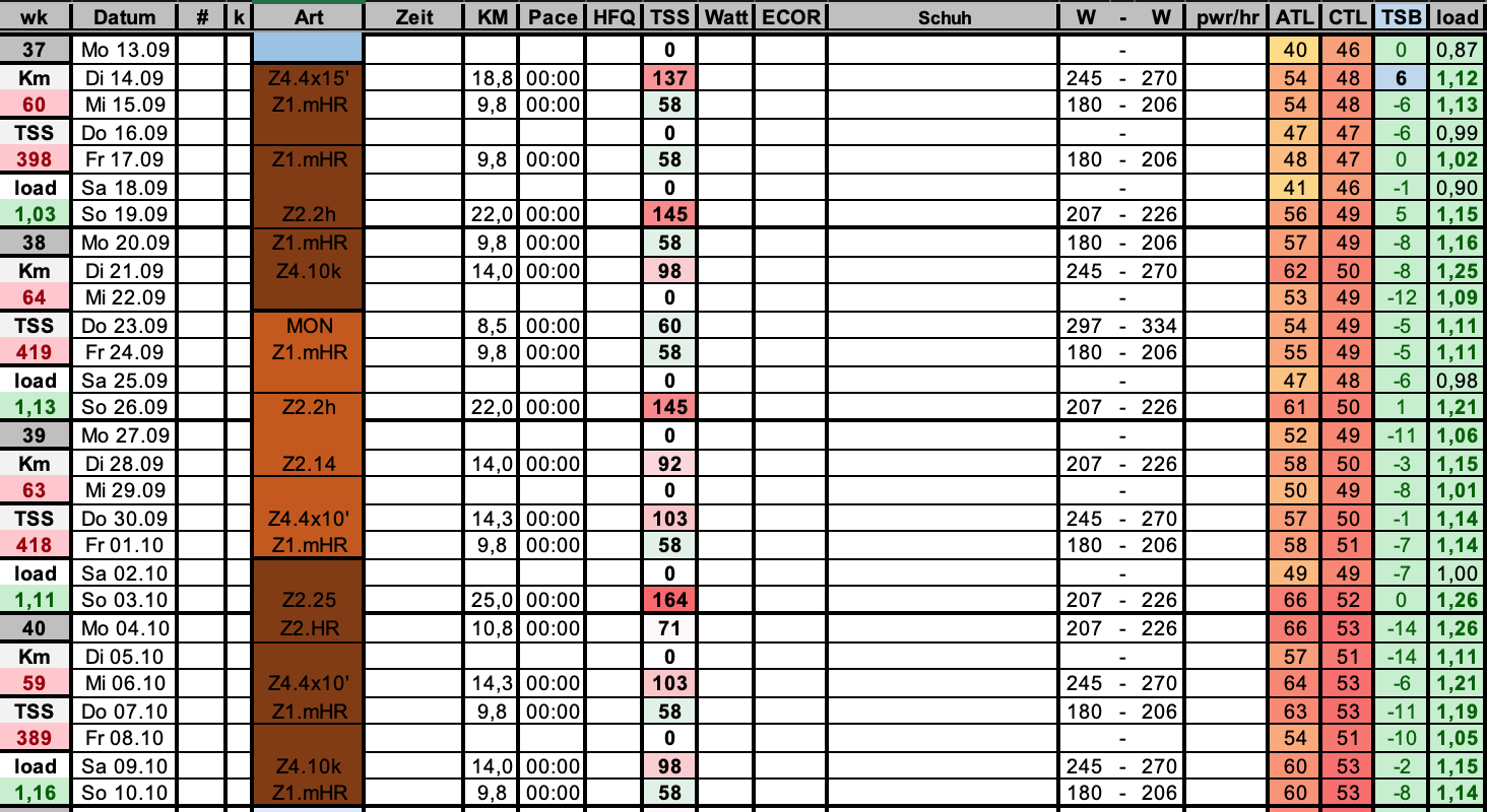 Wie ich oben schon erwähnt habe rechne ich mir für jede Einheit aus, welche Belastung sie in etwa haben wird (in TSS), um das Training nicht zu stark zu steigern. Dafür behalte ich immer die Differenz und das Verhältnis aus der Belastung der letzten 7 Tage (ATL, Acute Training Load) und der letzten 42 Tage (CTL, Chronic Training Load) im Auge [TSB, workload ratio] und passe die Einheiten dann dementsprechend an, falls es zu schnell zu viel Belastung sein sollte.