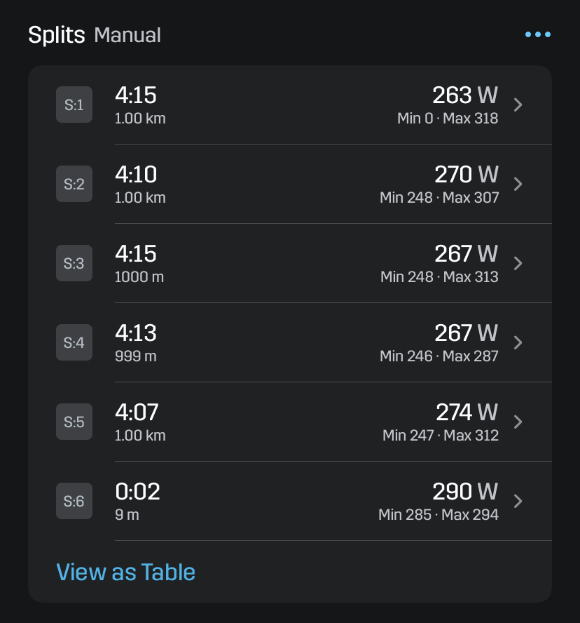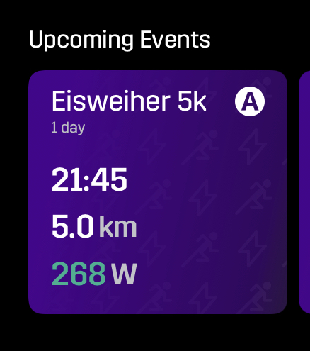 Mangels absolvierter 5k Rennen benutze ich meine aktuelle 10k Prognose für dieses Rennen, diese liegt aktuell bei einer Pace von 4:23 (21:56) und 259 Watt. Für die 5k kann man sicher noch ein paar % drauf geben, das würde dann auch ganz gut mit der Prognose aus der Stryd-App übereinstimmen (sieht Bild unten). Aus diesen Prognosen leite ich das Ziel ab auf jeden Fall unter 22 Minuten bleiben zu wollen und in Richtung 21 Minuten zu Schielen.