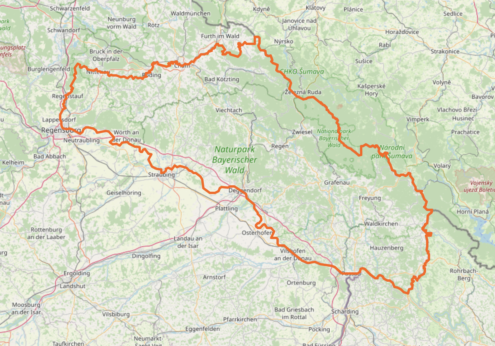 Die südliche Grenze ist hierbei die Donau, die nord-östliche Grenze bildet die Landesgrenze zu Tschechien. Im Westen und Norden ist der Regen bis Cham die Grenze und weiter nach Osten die Chamb. Die letzen Kilometer von südlich von Furth im Wald bis zur tschechischen Grenze verlaufen dann entlang von Landkreisgrenzen, die ich aber nicht genauer definieren kann.