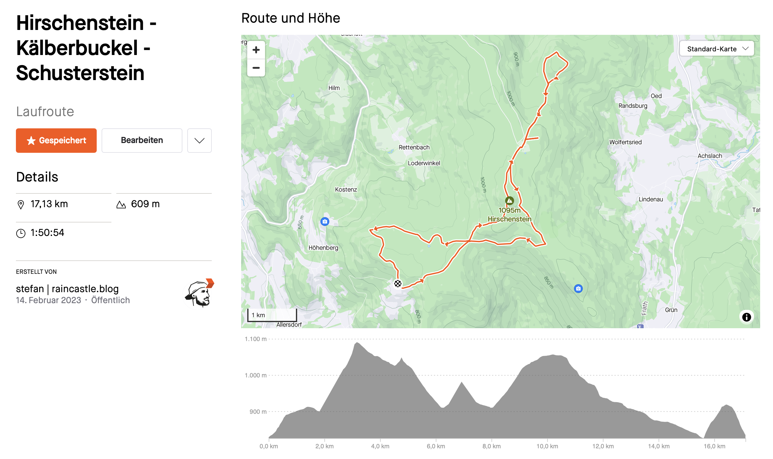 Als nächstes werde ich mich erstmal wieder an den Hausberg (Bogenberg) wagen um mich dort wieder an die Höhenmeter zu gewöhnen und dann habe ich mir eine kleine Runde am Hirschenstein (mein zweiter Hausberg) ausgesucht, denn dort gibt es in der Nähe noch 2 unbesuchte Gipfel, die ich dann abhaken kann. Zum einen der Kälberbuckel (1053m) und der Schusterstein (998m), falls ihr Interesse habt, hier der GPX-Track für eure Uhr.