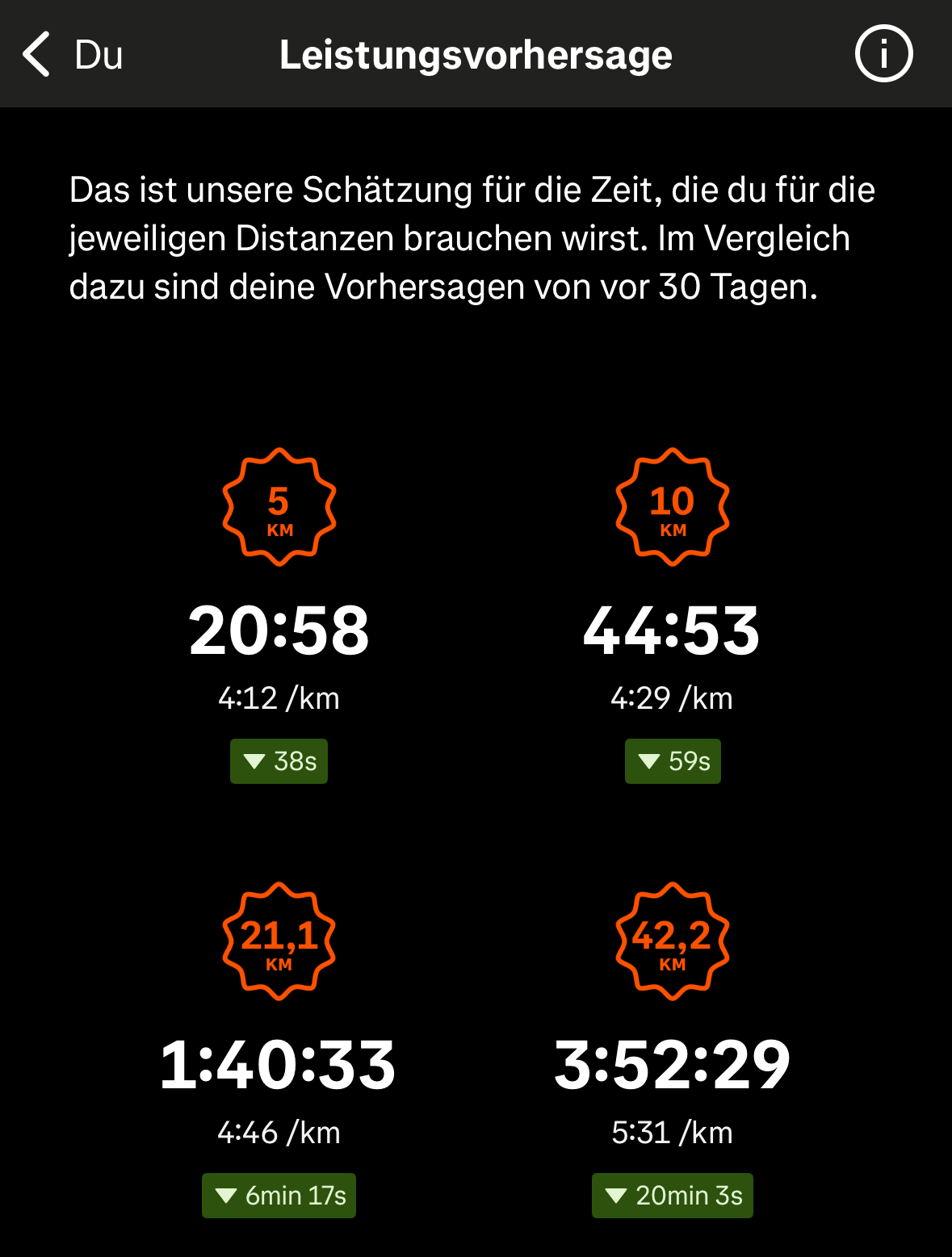 Strava prognostiziert für die 10 km eine Zeit von 44:53 min.